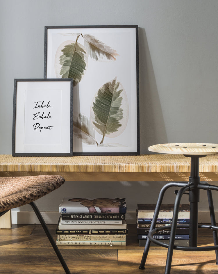 Lámina decorativa con texto: 'Inhale, Exhale, Repeat.'