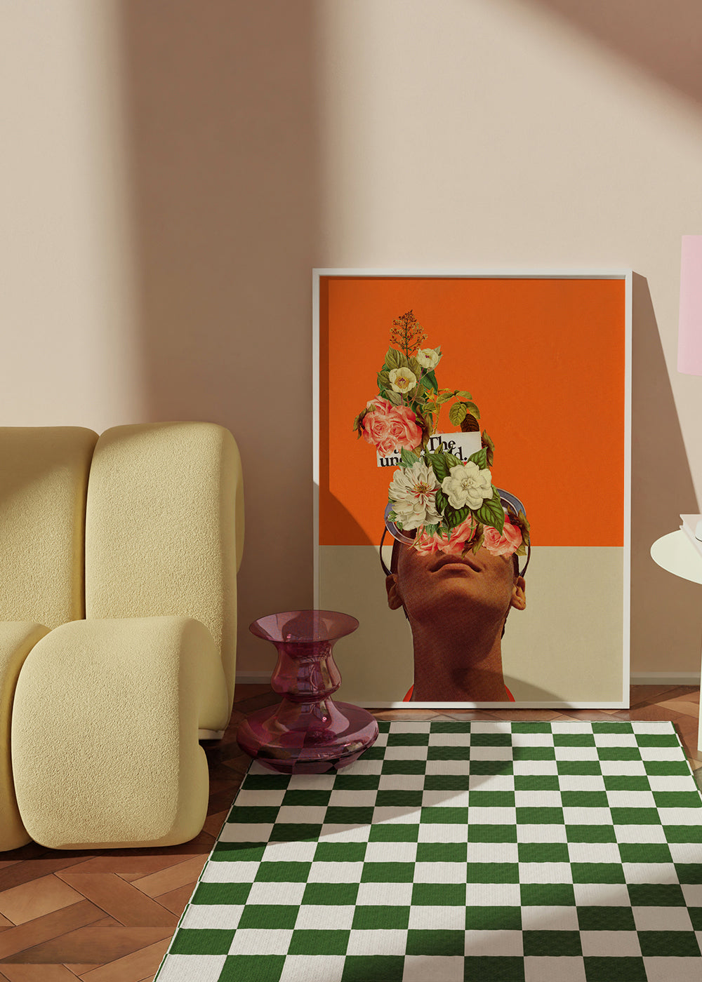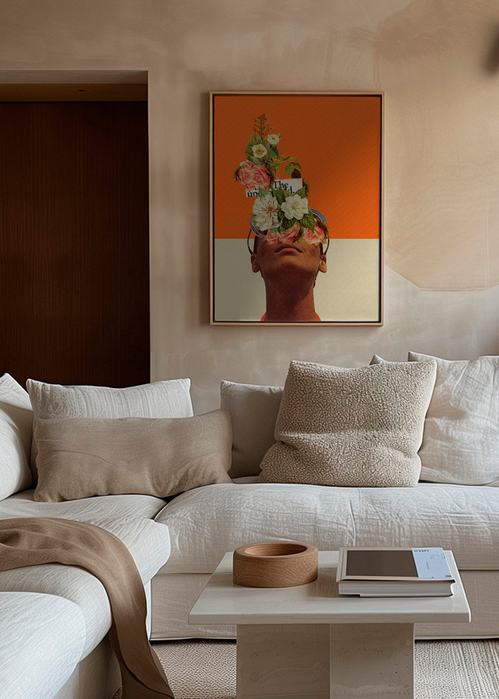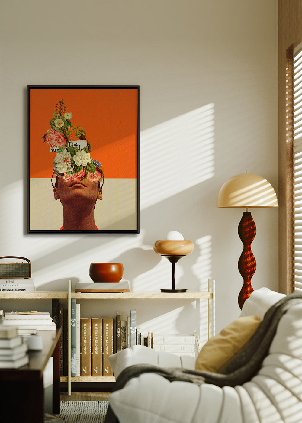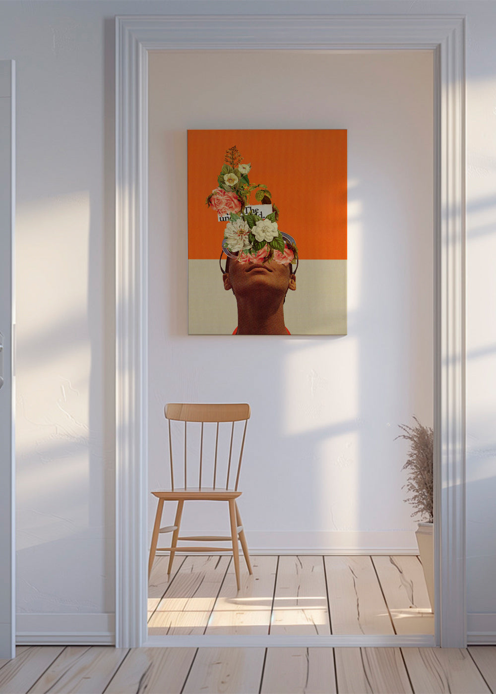 Un diseño de la serie de cuadros de mujeres, que nos presenta Frank Moth, con matices de colores naranjas, y de formato vertical. Una obra de estilo retro ideal para una decoración con toques vintage. Olvídate de las paredes aburridas y sosas.