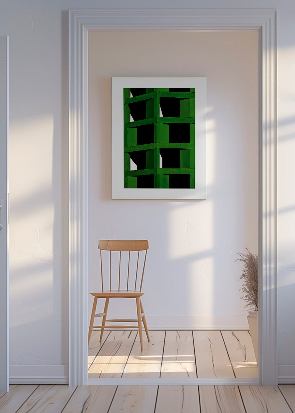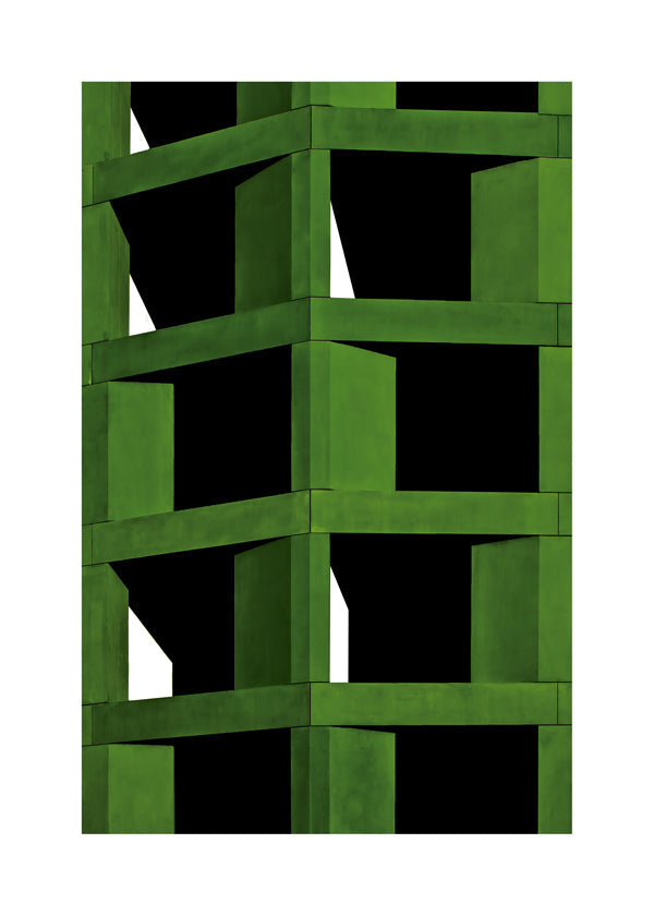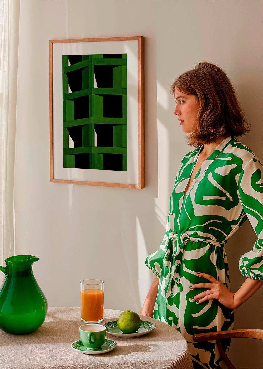 Un póster perteneciente a la categoría de cuadros y láminas de arquitectura, con matices de colores verdes, y ideal para poner en posición vertical. Los cuadros geométricos son una buena opción para decorar espacios modernos y vanguardistas. Añade un poco de arte a la decoración de tu hogar. El margen blanco que envuelve a la imagen potencia la expresividad de la obra.