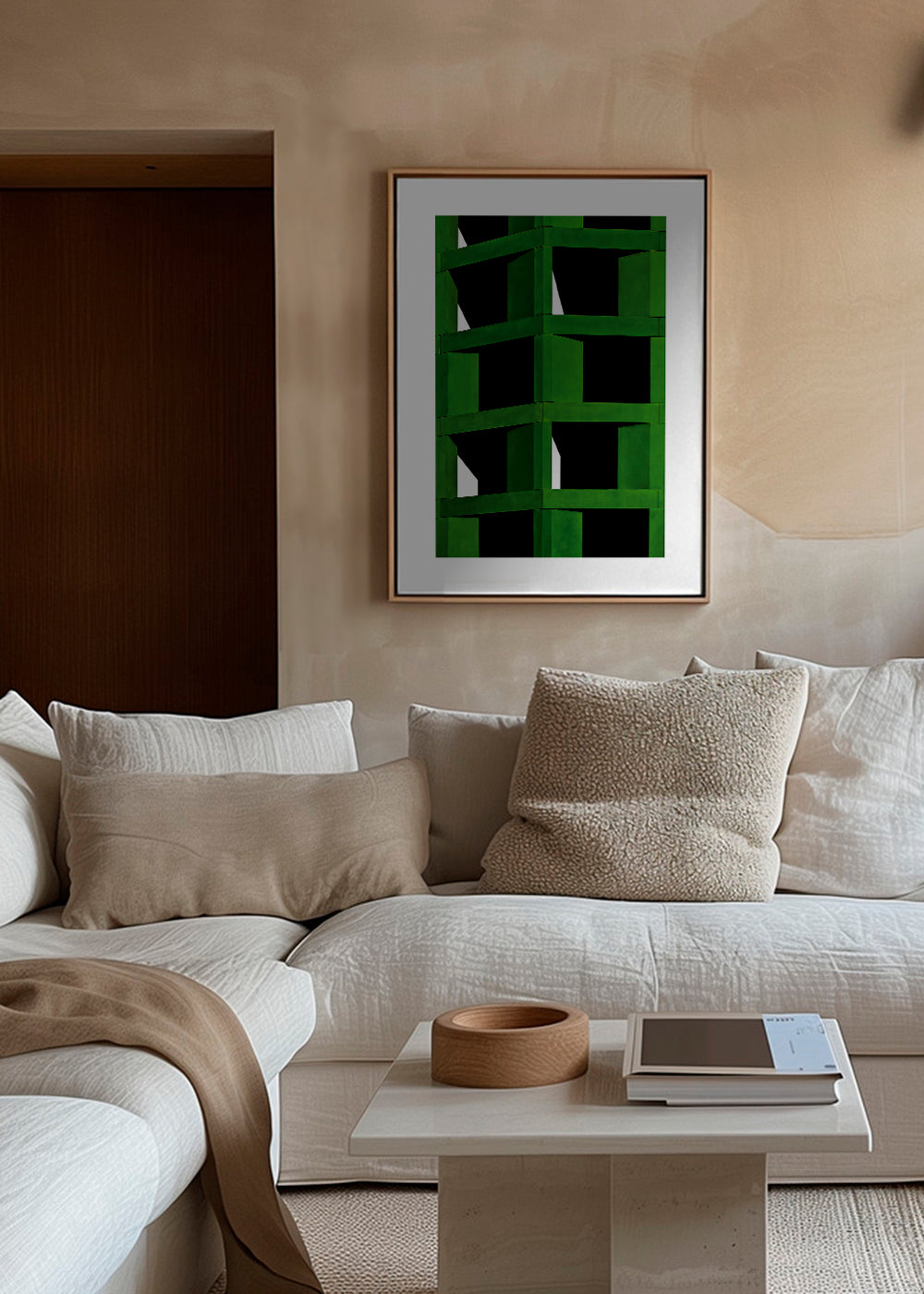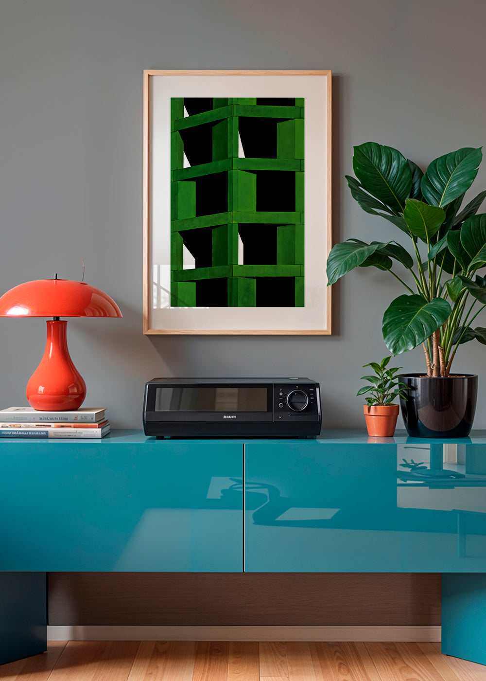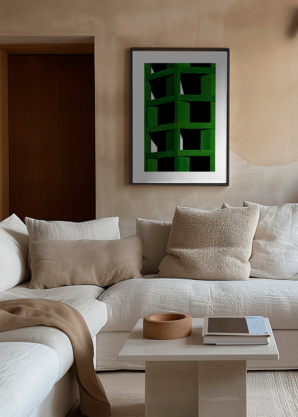 Un póster perteneciente a la categoría de cuadros y láminas de arquitectura, con matices de colores verdes, y ideal para poner en posición vertical. Los cuadros geométricos son una buena opción para decorar espacios modernos y vanguardistas. Añade un poco de arte a la decoración de tu hogar. El margen blanco que envuelve a la imagen potencia la expresividad de la obra.
