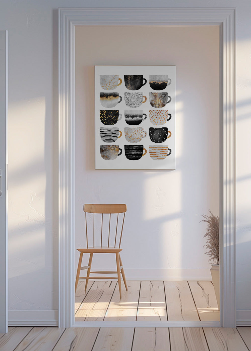 Lámina decorativa moderna de unas tazas de café con texturas y colores muy bonitos.