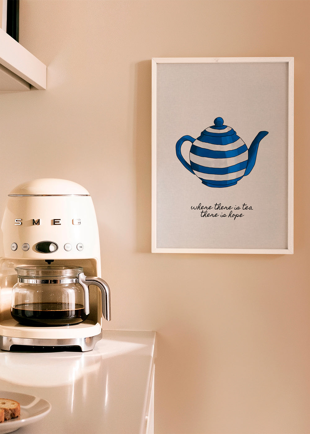 Una obra de nuestro repertorio de cuadros de café, original de Orara Studio, con toques azules, y en formato vertical. La cocina también puede ser un espacio acogedor, combina este diseño con otros cuadros para cocina y crea una cocina súper chic. Dale un toque artístico a tu decoración.
