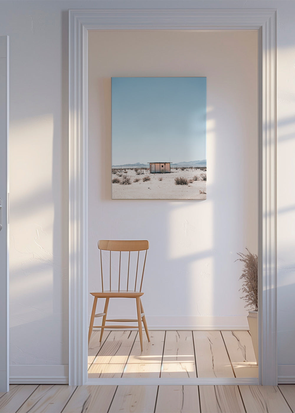 Fantástica fotografía de una casa en medio del desierto que puedes combinar con otras obras de cactus o motivos típicos del desierto para crear un bonito mural.