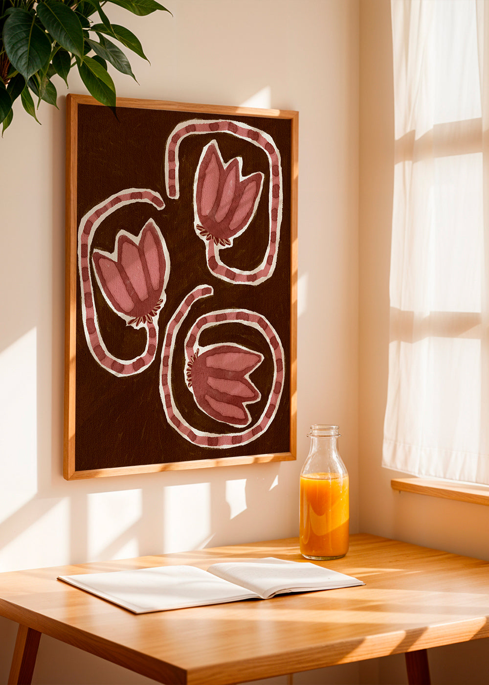 Arte que cuenta. Dibujo encantador Visión del artista Shatha Dafai. Composición vibrante de marrones composición perfecta en vertical. Las láminas con ilustraciones son perfectas para llenar las paredes de creatividad. Transforma tus paredes aburridas