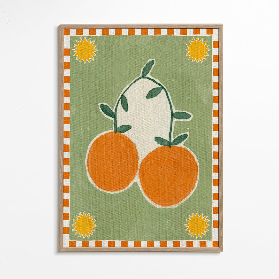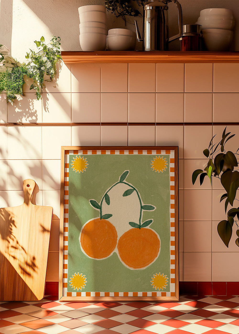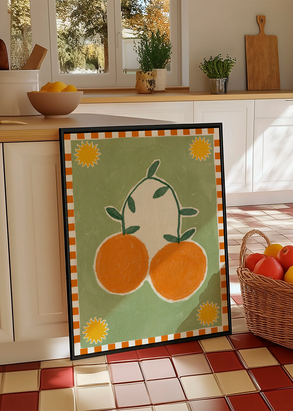 Personajes con historia. Dibujo encantador Una obra maestra de Shatha Dafai. Con tonos naranjas estilizado en formato vertical. Las ilustraciones son una de las formas más claras del arte, este es un diseño que no dejará a nadie indiferente. Haz que tus paredes destaquen