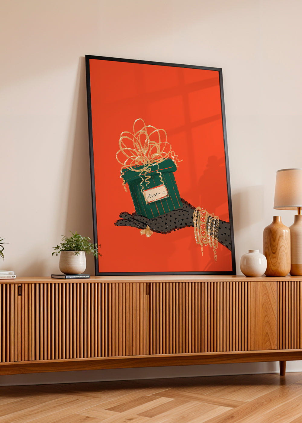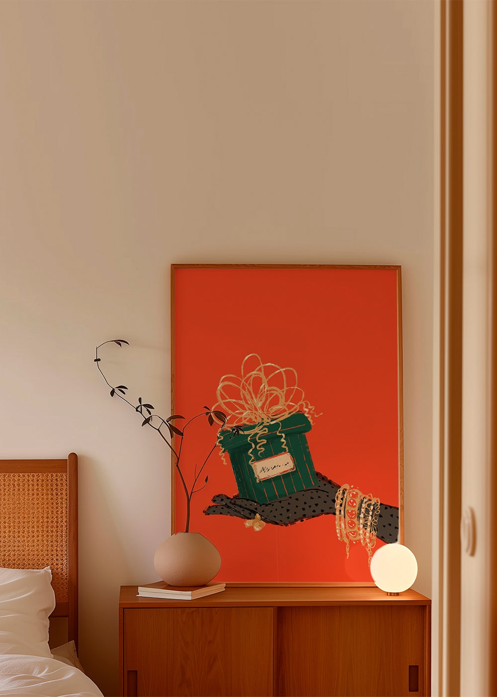Arte que cuenta. Dibujo encantador Visión del artista Ludivine Josephine. Resaltado con tonos rojos composición perfecta en vertical. Los cuadros con ilustraciones son ideales para combinar con arte minimalista y abstracto. Haz que tus paredes destaquen