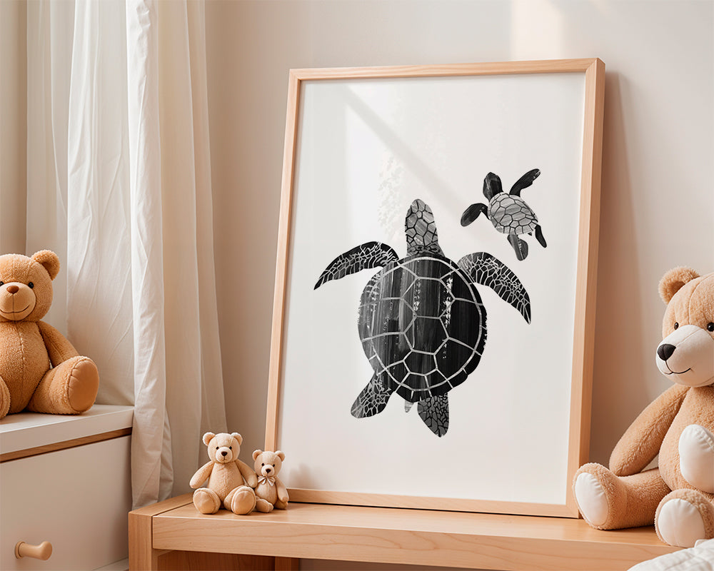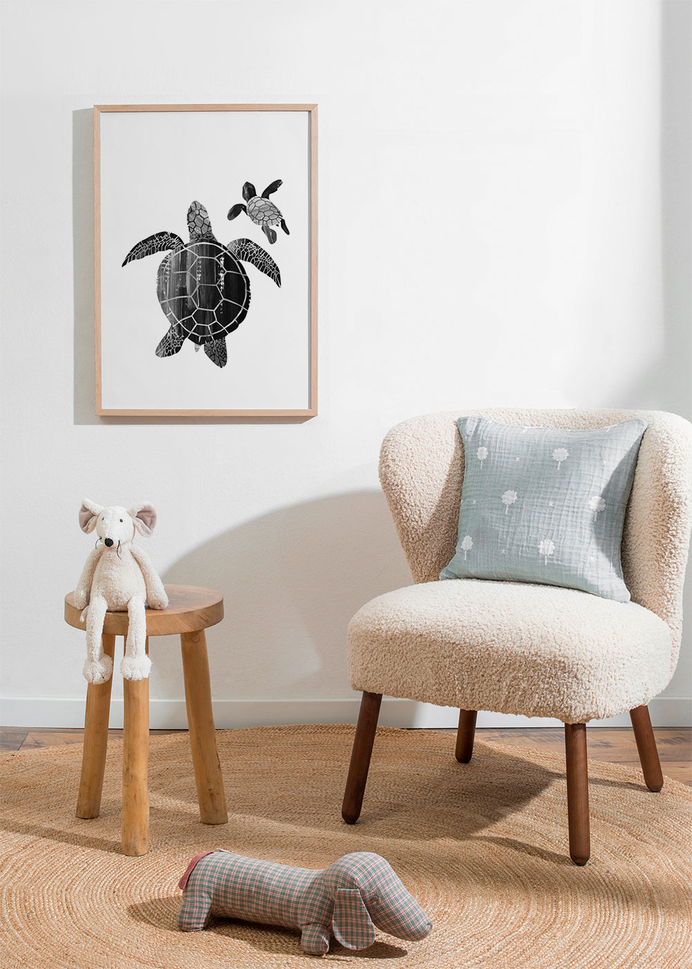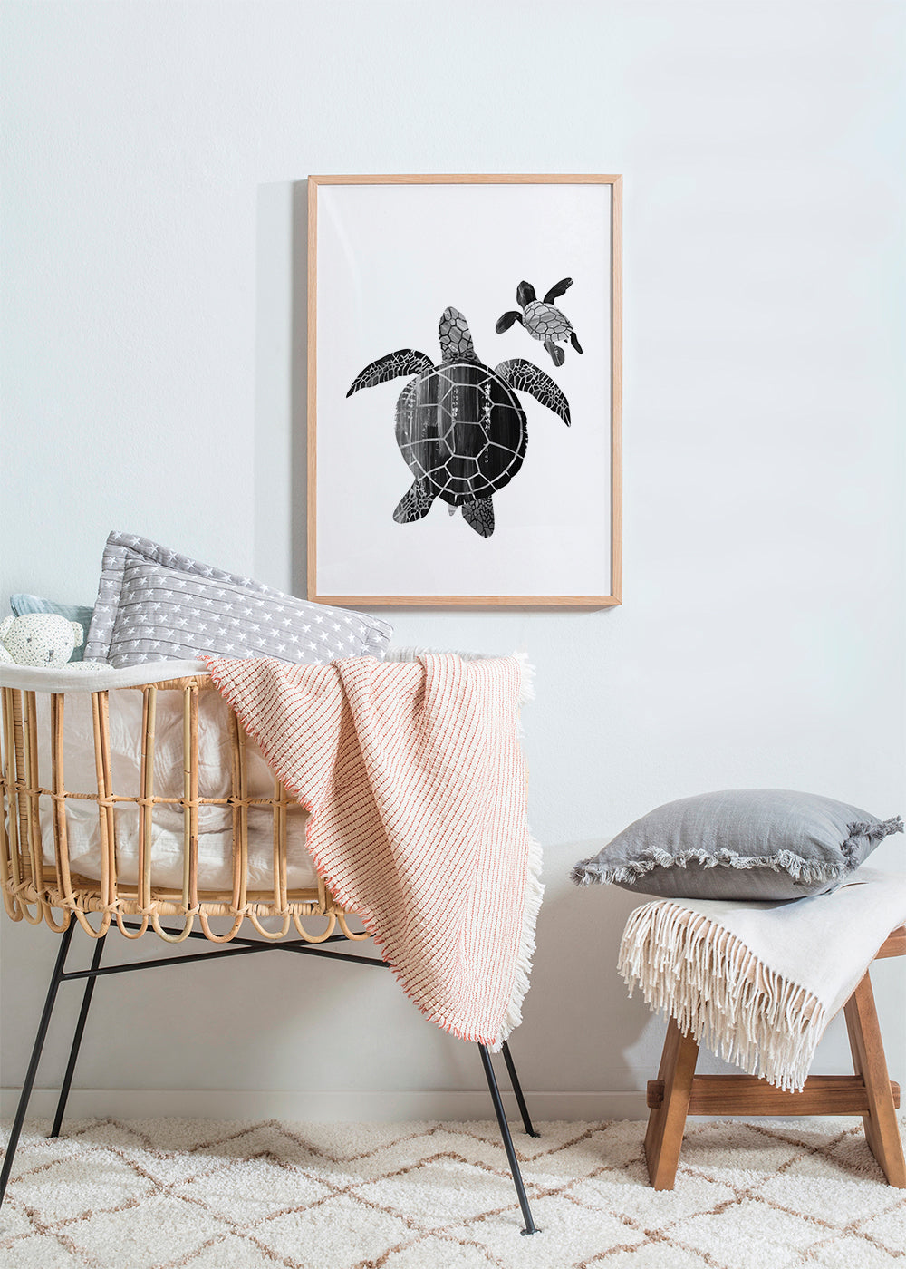 Lámina infantil en blanco y negro de dos tortugas nadando. Pertenece a las ilustradoras holandesas Goed Blauw.
