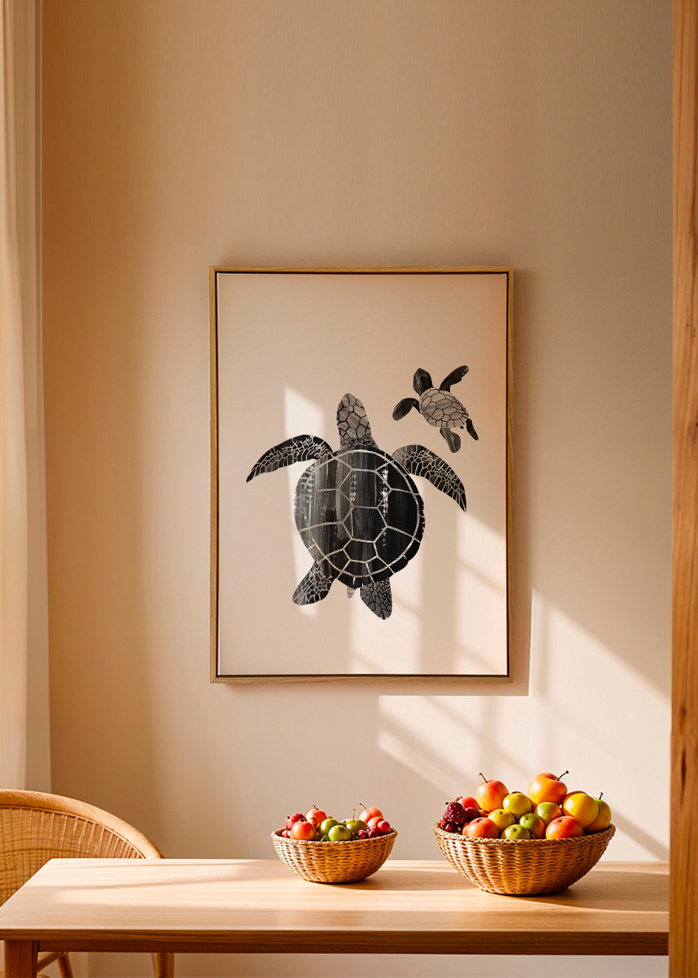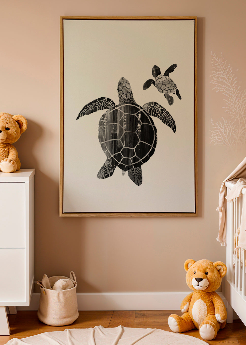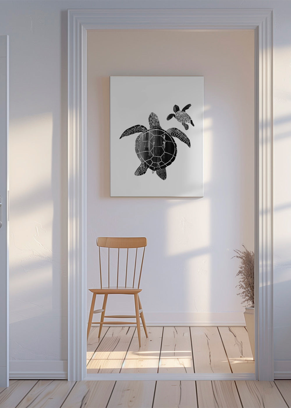 Lámina infantil en blanco y negro de dos tortugas nadando. Pertenece a las ilustradoras holandesas Goed Blauw.