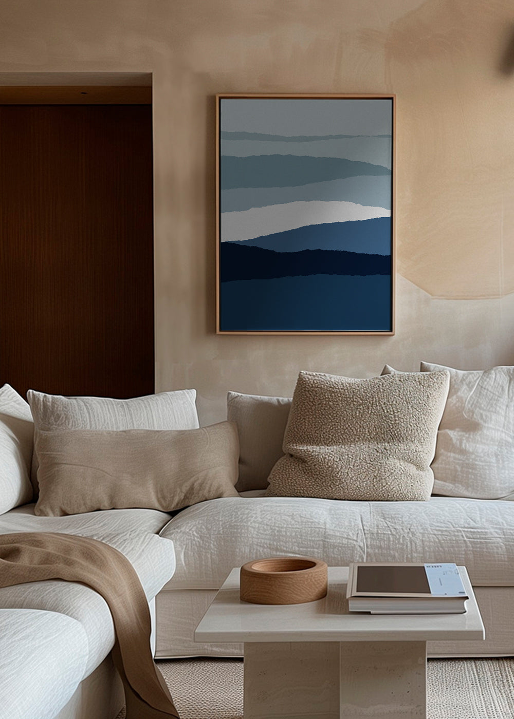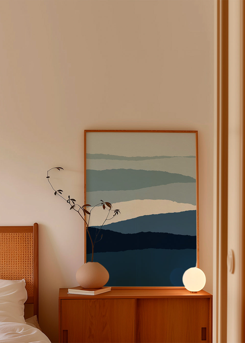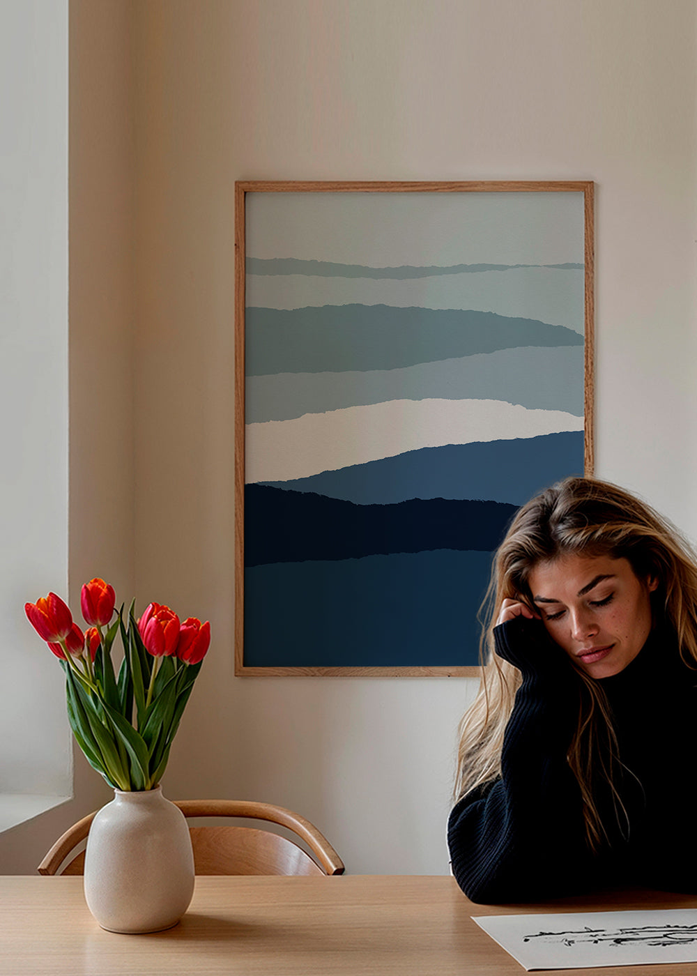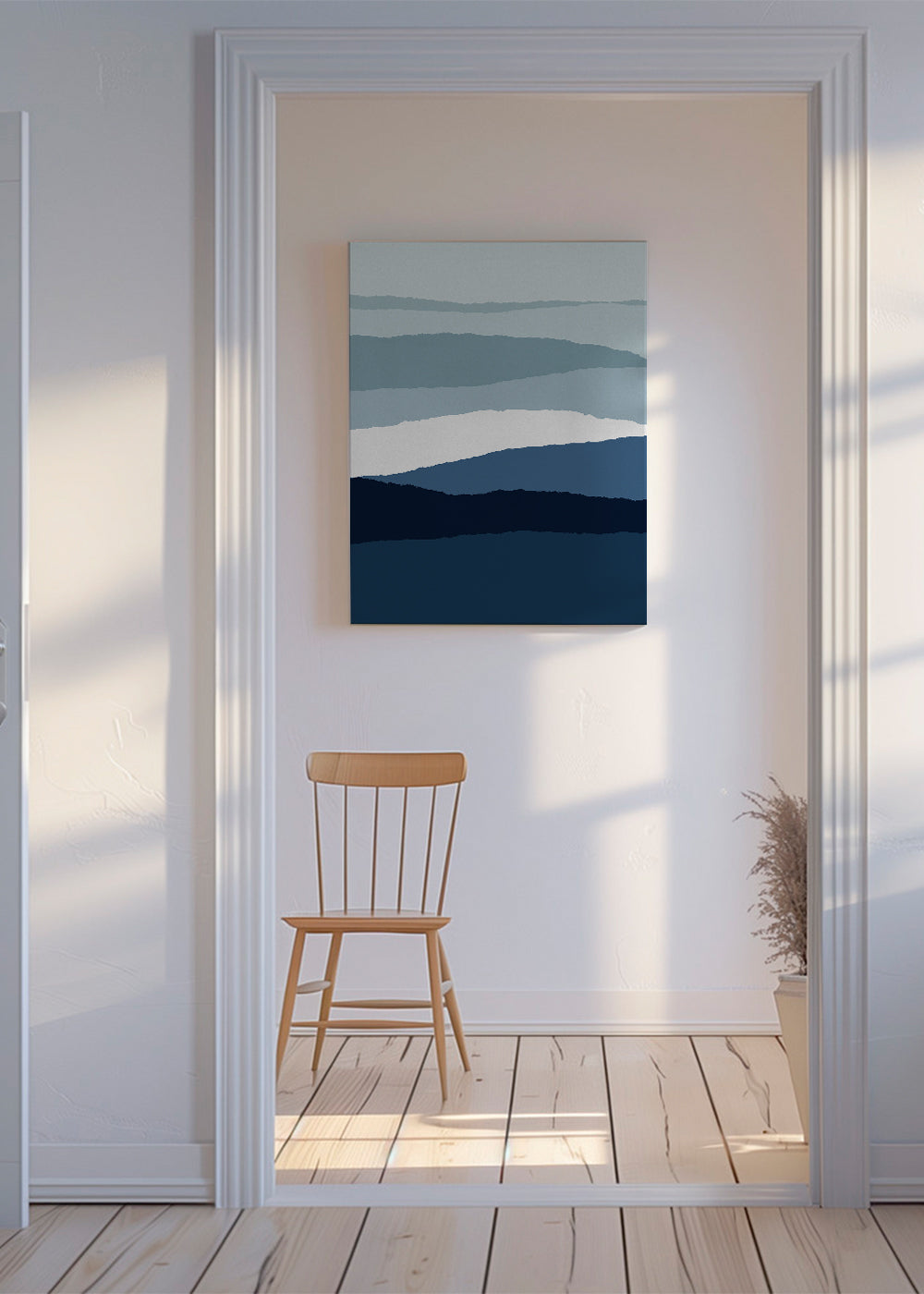 Bonita pieza de nuestro conjunto de cuadros de montañas, hecha por Orara Studio, con matices de colores azules, y orientada en vertical. La decoración con paisajes aporta un aire fresco a cualquier interior. Viste las paredes de tu hogar.