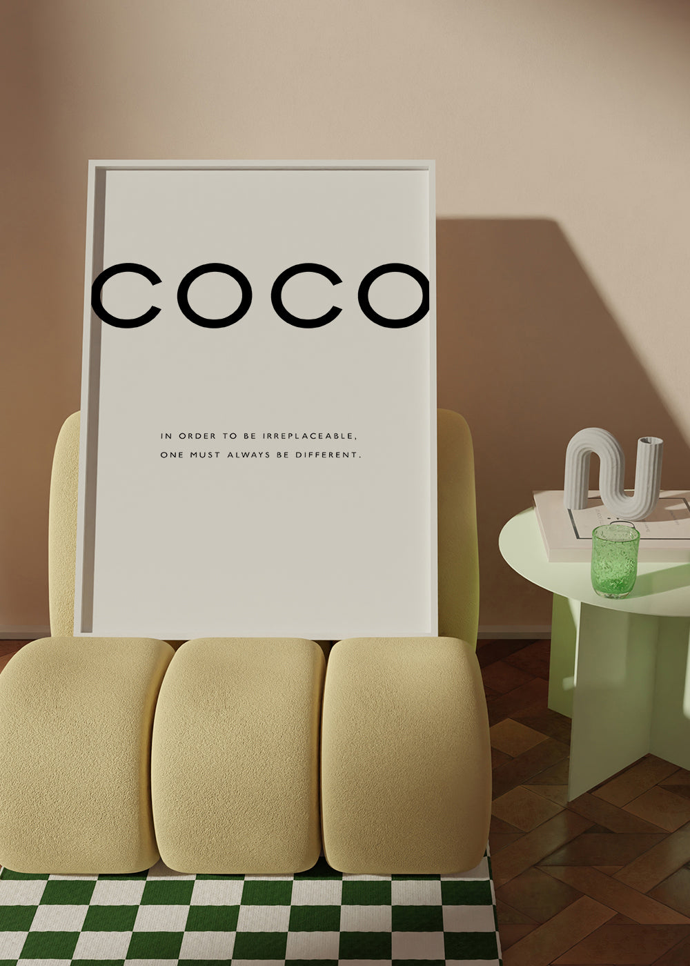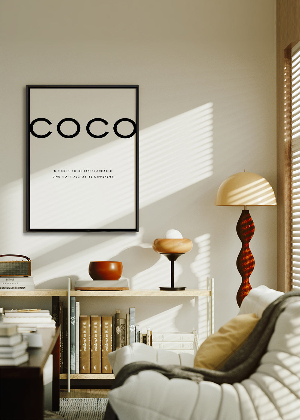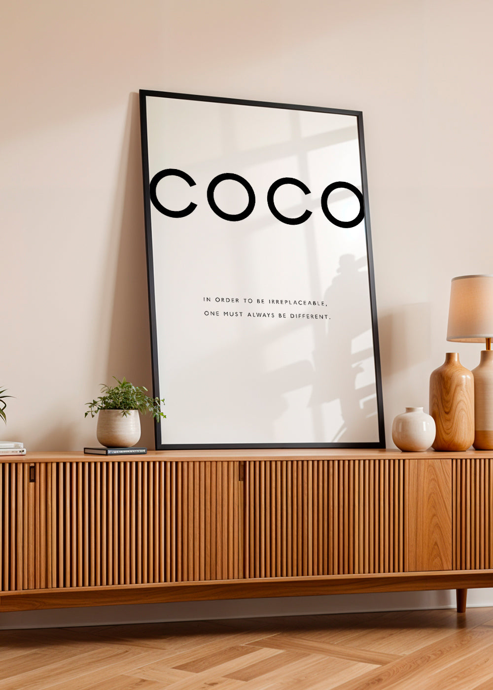 Cuadro moderno y elegante de Coco Chanel con la frase "in order to be irreplaceable, one must be different".