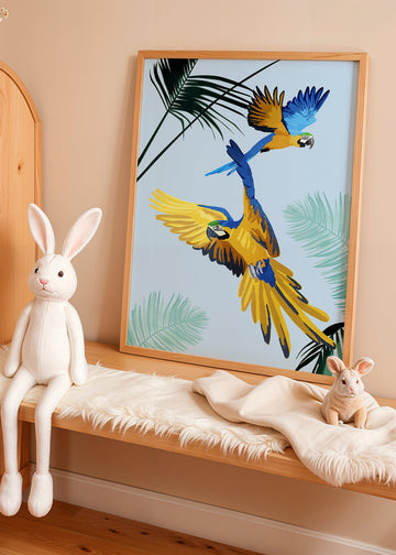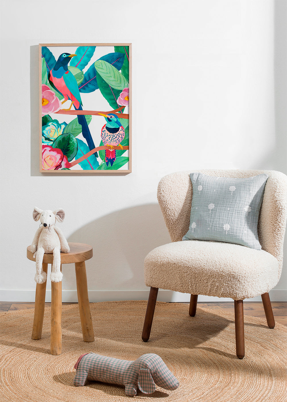 Colorido póster de dos pájaros sobre dos ramas bien coloridas. Puedes encontrar más pósters similares en nuestra sección de Animales.