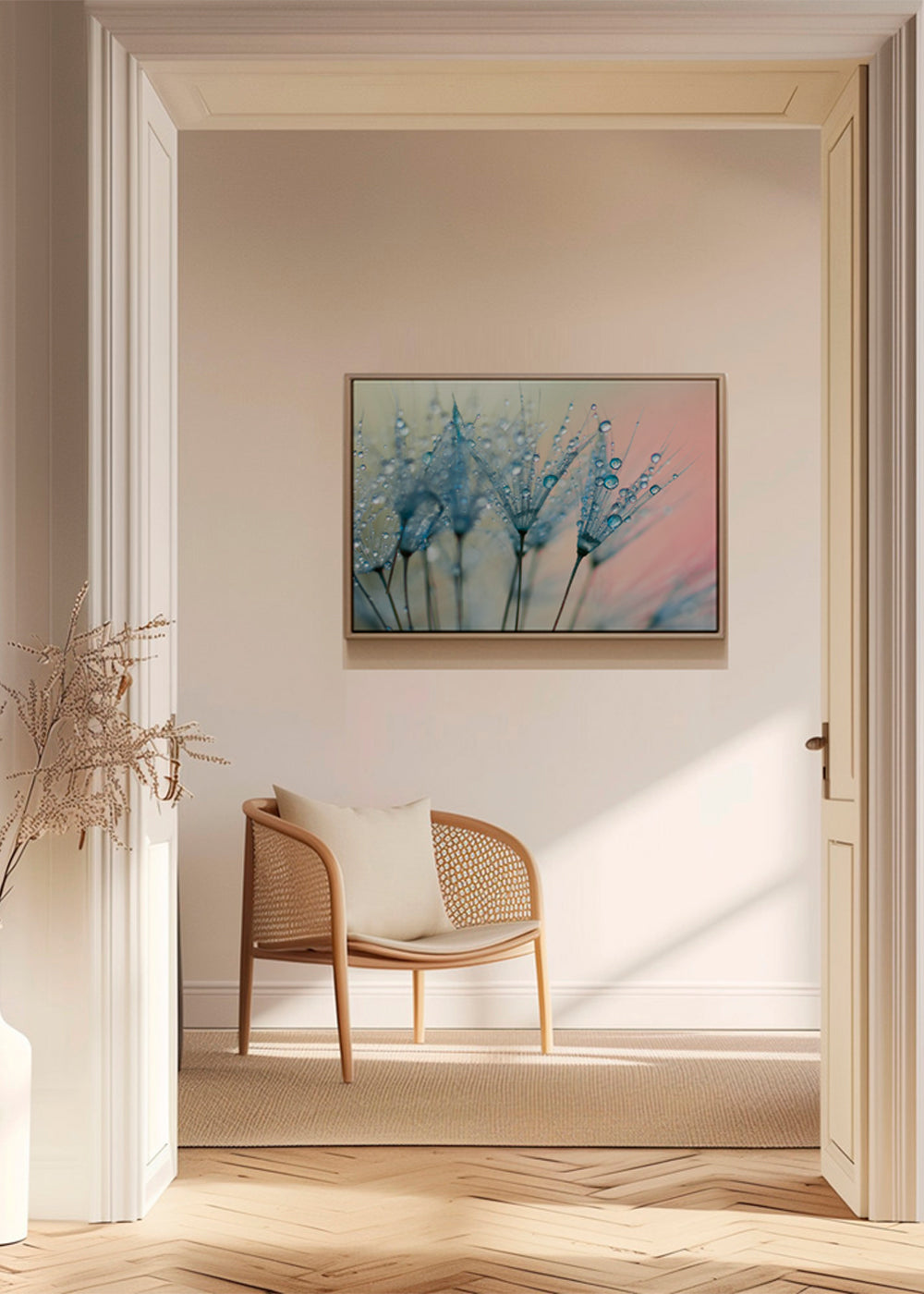 Bonito cuadro de la serie de cuadros de flores y plantas, perteneciente a la colección de Ingrid Beddoes, de matices azules, y en formato horizontal. Un bonito paisaje ideal para combinar con otros cuadros de naturaleza. Deja tus paredes a cuadros.
