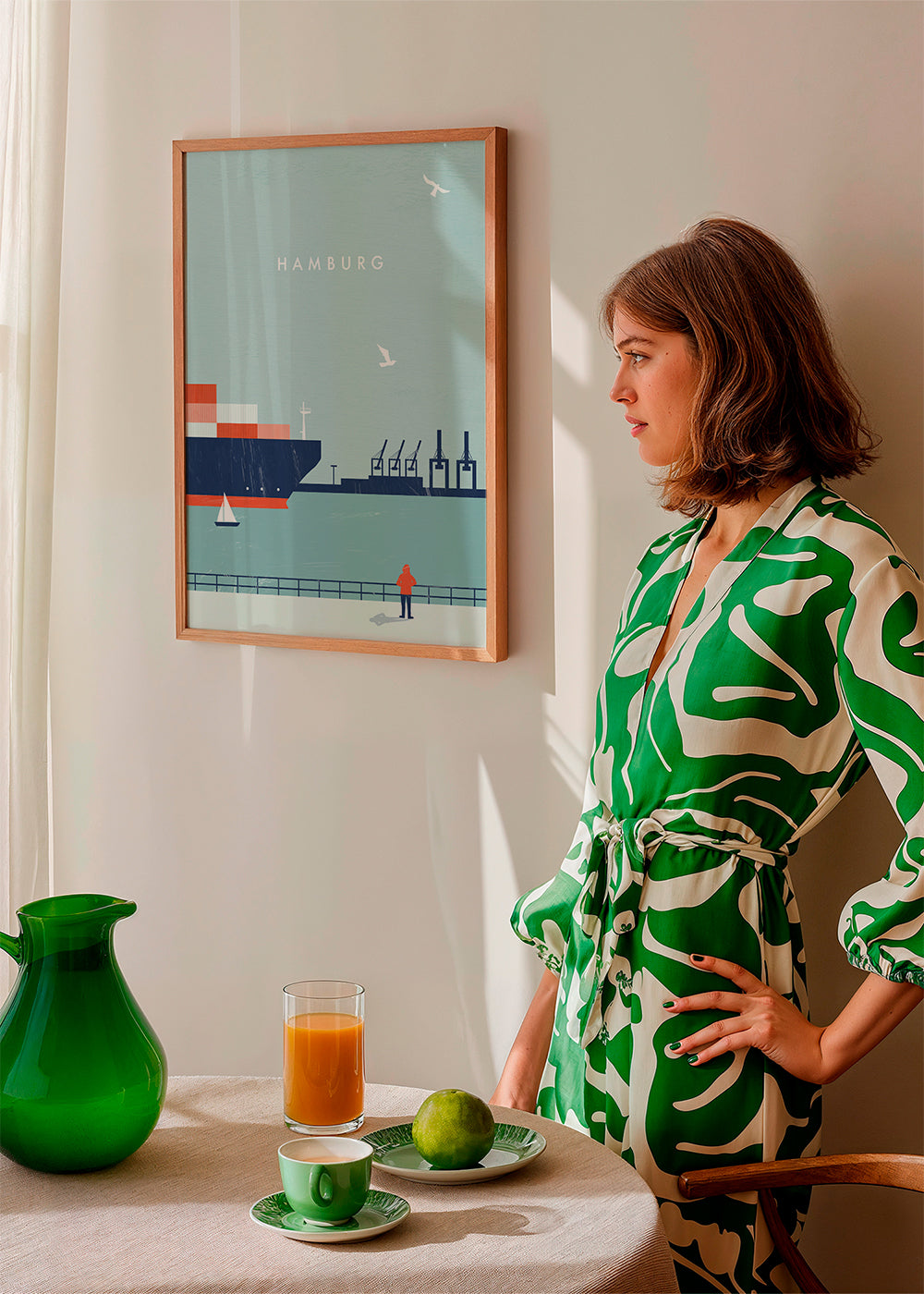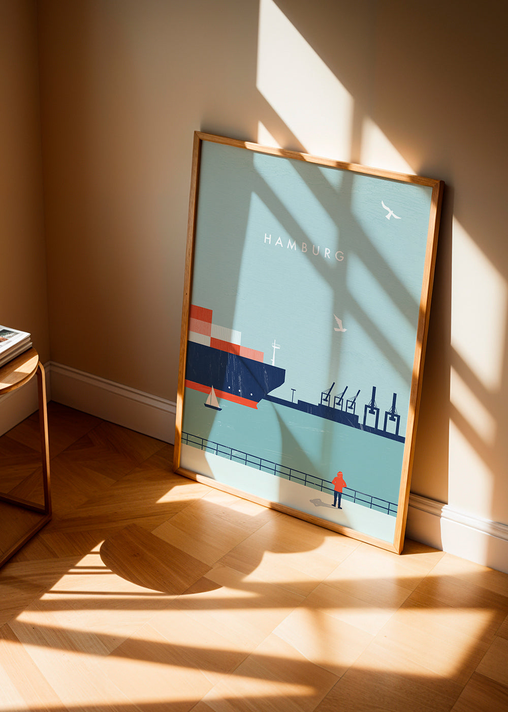 Moderna ilustración de Hamburgo y su famoso puerto. Katinka Reinke se dedica a ilustrar ciudades con su estilo personal y que nos permiten disfrutar de una pequeña ventana en nuestras paredes para ver preciosas estampas.
