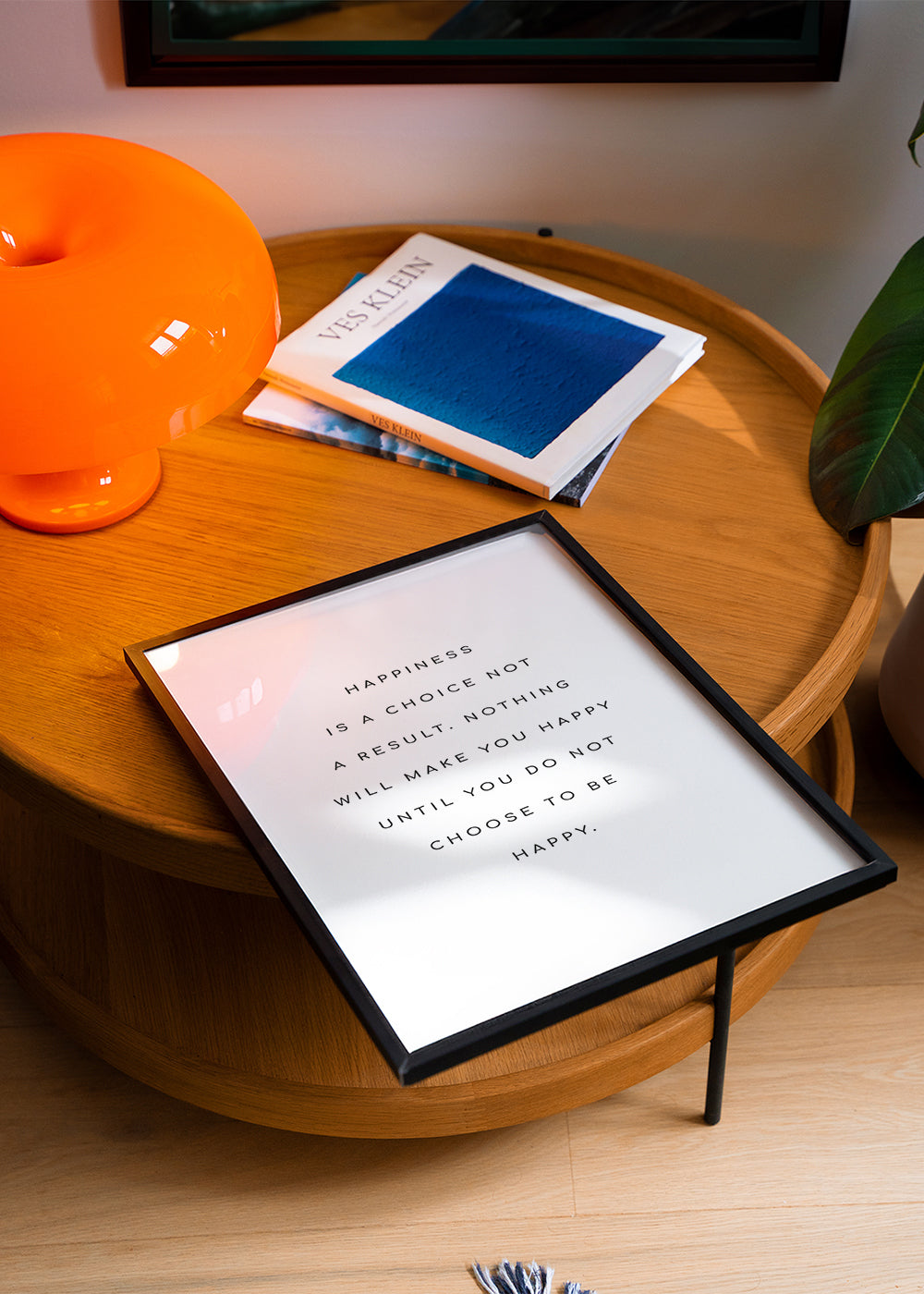 Moderno cuadro decorativo con el siguiente texto: "Happiness is a choice not a result. Nothing will make you happy until you do not choose to be happy". Para encontrar otros cuadros del mismo estilo, puedes ir a nuestra categoría "cuadros con textos y frases".