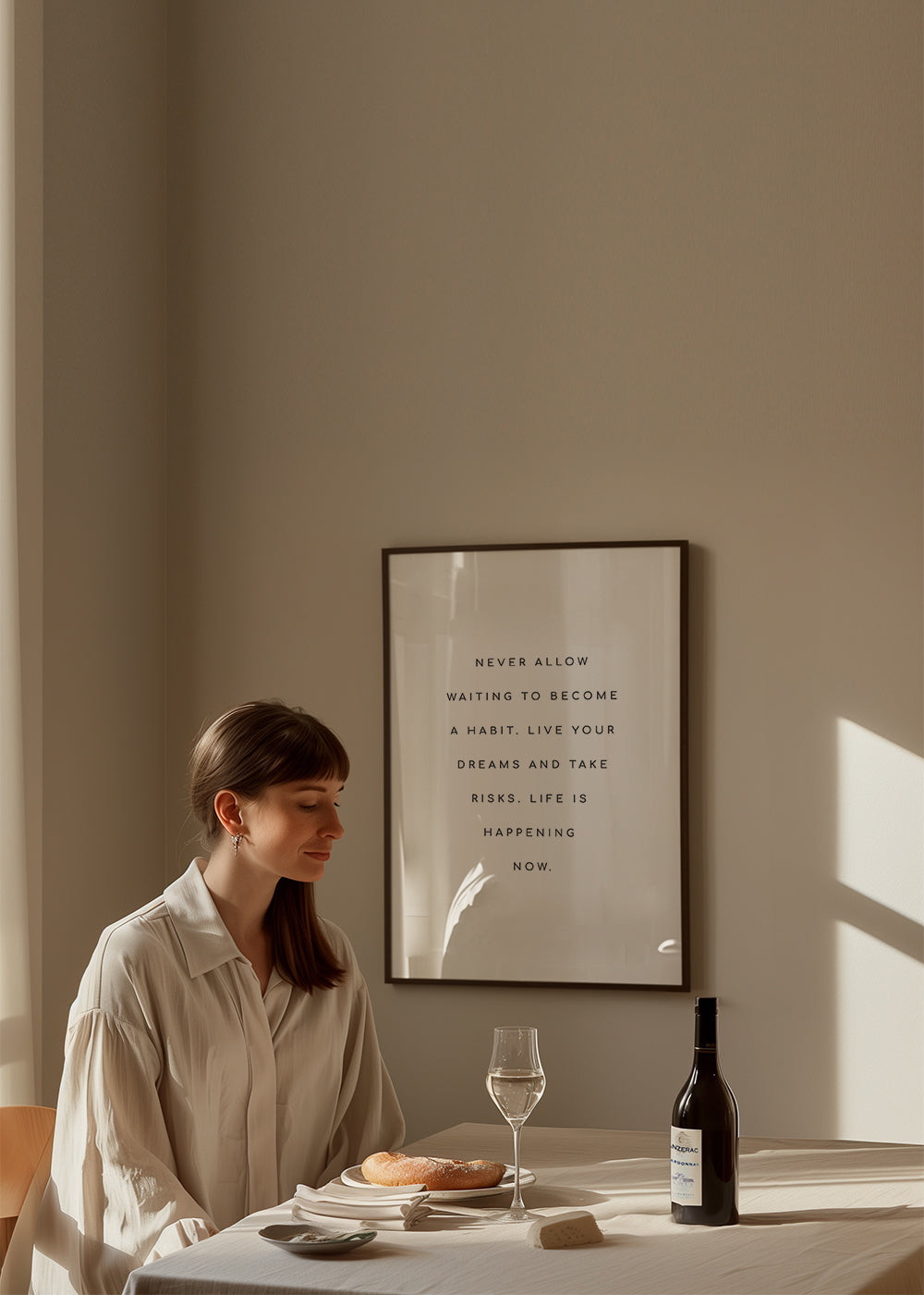 Un moderno cuadro decorativo con el siguiente texto: "Never allow waiting to become a habit. Live your dreams and take risks. Life is happening now". Tenemos más obras del mismo estilo en nuestra categoría "cuadros con textos y frases".
